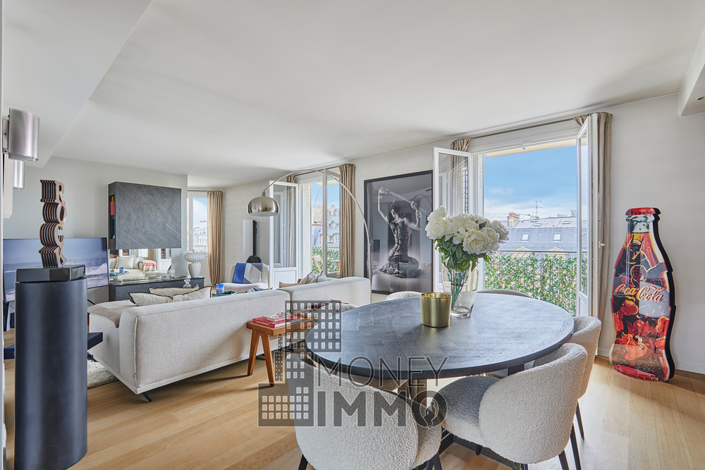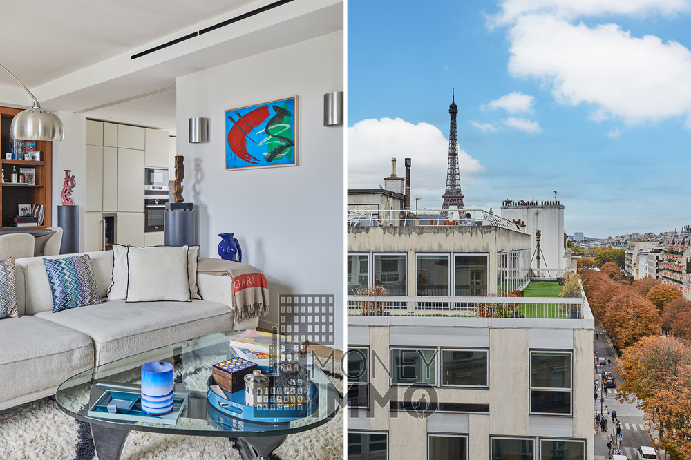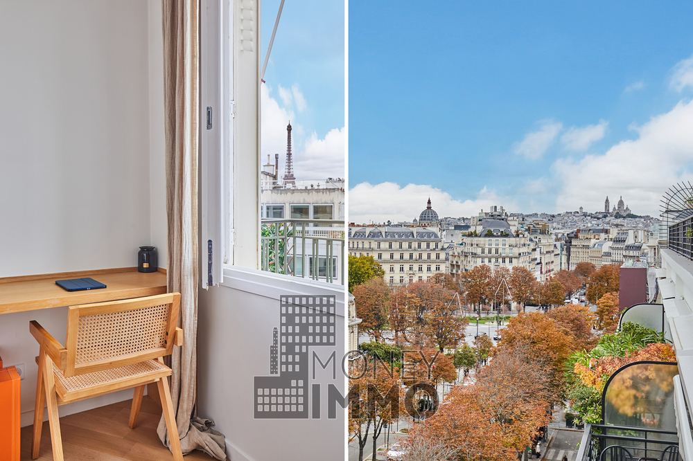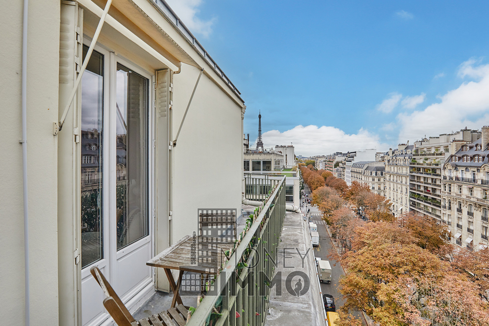 Cet appartement entièrement climatisé, dispose d'un balcon filant de 20 m² avec vue imprenable sur la Tour Eiffel et l’avenue Montaigne.