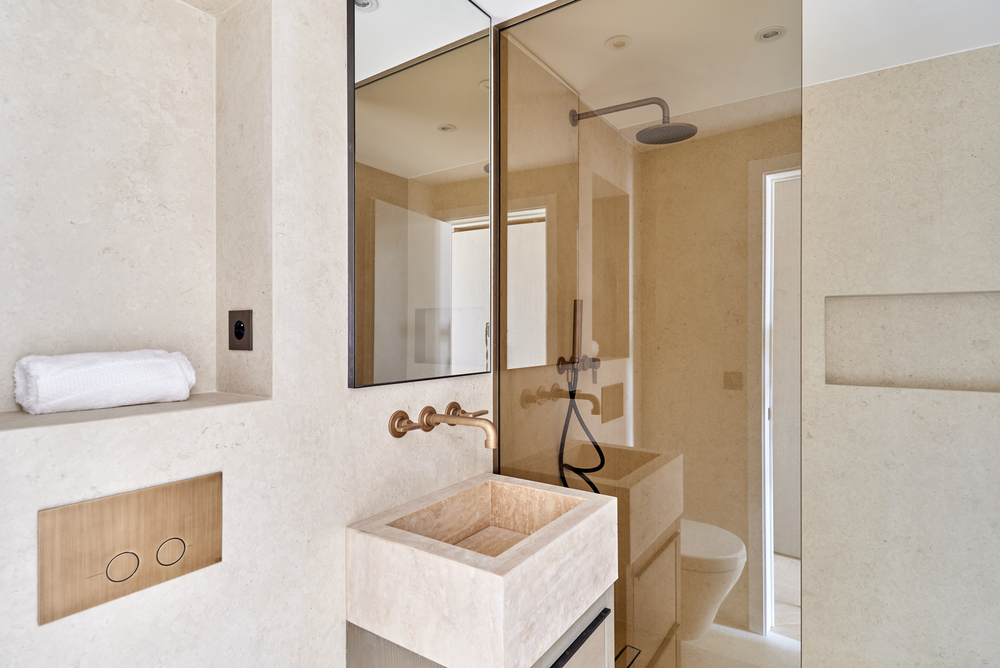 Il se compose d’une entrée avec salon d’accueil, d’une spacieuse pièce de vie lumineuse avec cuisine américaine équipée et meublée, de deux chambres, chacune avec sa salle de bain et son dressing, d’une salle de sport, d’une buanderie et d’un WC séparé.